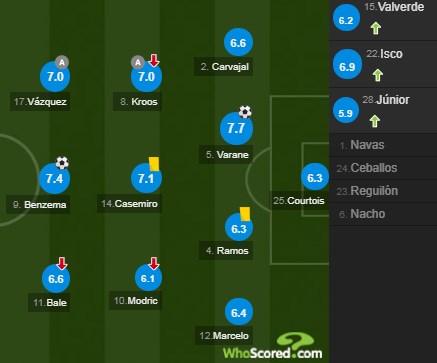 Qendërmbrojtësi Raphael Varane (7.7) ishte më i miri te Los Blancos, pasi pos fazës ofensive arriti edhe të shënonte gol.