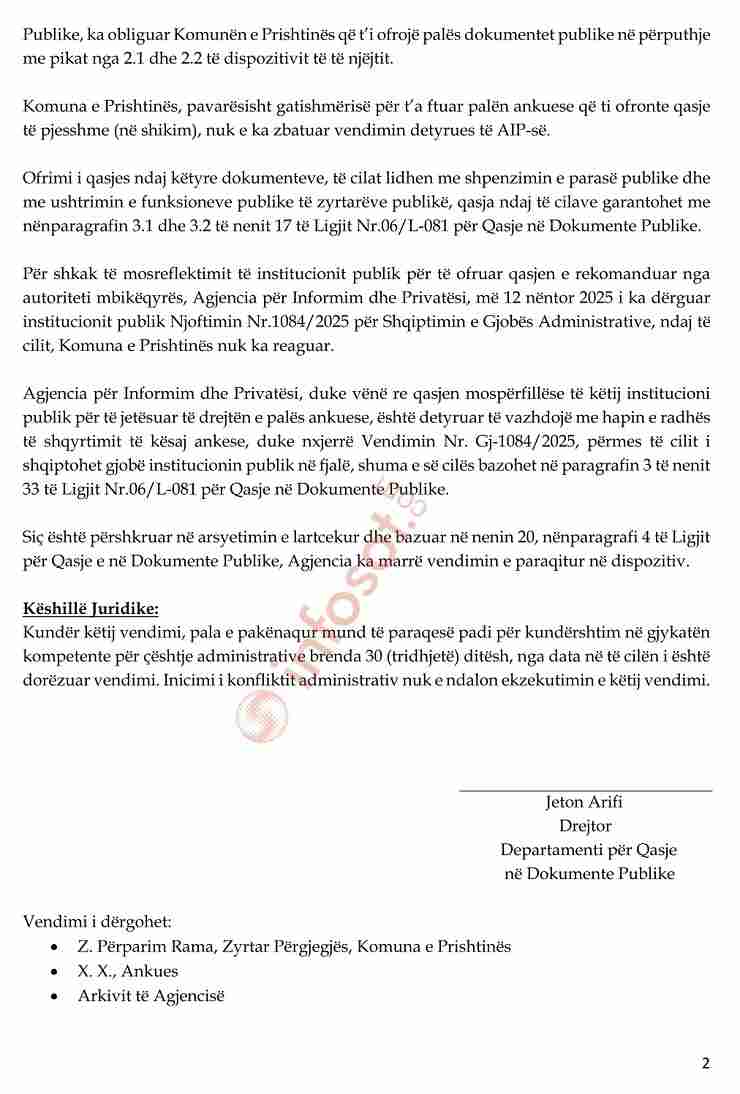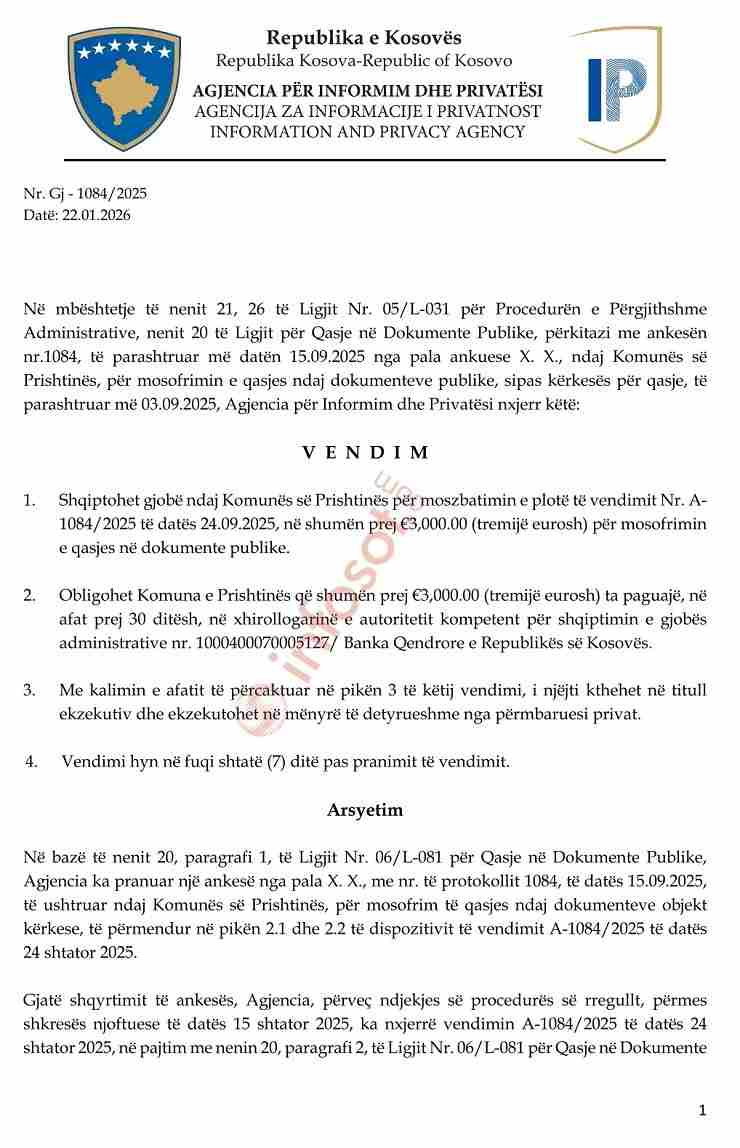 Vendimi është marrë pas një ankese të bërë nga një qytetar në shtator të vitit 2025, i cili kishte kërkuar qasje në dokumente që lidhen me shpenzimet dhe aktivitetet e institucionit. Nga shtatori i vitit të kaluar tek në fund të janarit AIP morri vendim duke shqiptuar gjobë për Komunën e Prishtinës.