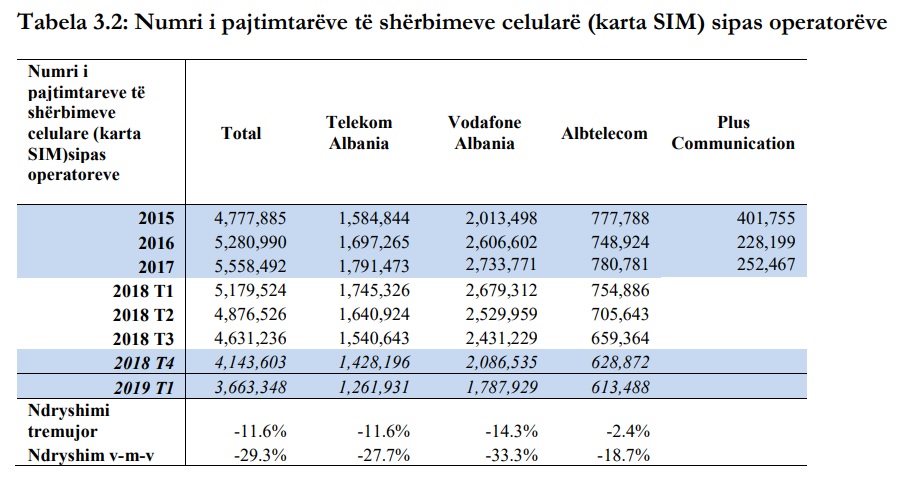 Numri i pajtimtarëve është shumë larg rekordit të arritur në 2017-ën kur ishin 5.5 milionë karta SIM të regjistruara.