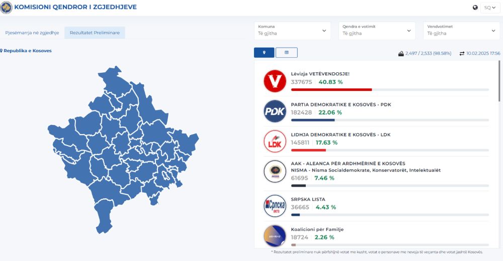 Sipas këtyre rezultateve, Lëvizja Vetëvendosje është e para me 40.83 përqind, Partia Demokratike e Kosovës e dyta me 22.06 përqind, Lidhja Demokratike e Kosovës e treta me 17.63 përqind dhe AAK me 7.46 përqind.