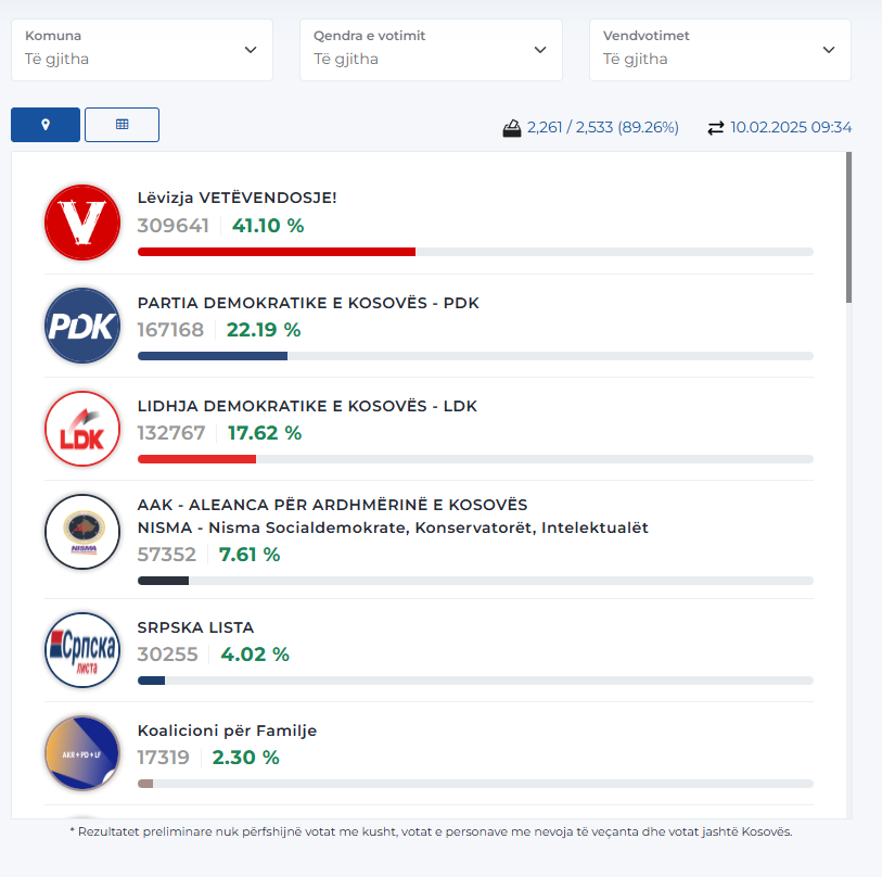 Lëvizja Vetëvendosje prin me 41.10 për qind të votave pas numërimit të 89.26 për qind të votave, apo 2 mijë e 261 kutive nga 2 mijë e 533 kuti sa janë gjithësej, sipas të dhënave të fundit të Komisionit Qendror të Zgjedhjeve të përditësuara në ora 09:34.