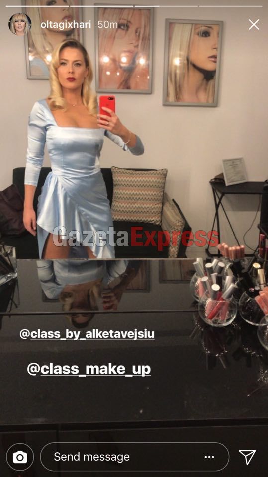 Kaq vezulluese Olta nuk ishte parë ndonjëherë. Gjithë kjo përgatitje është për një mbrëmje festimesh mes miqsh. Pranë saj gjendet dhe opinionisti Olti Curri. /Gazeta Express/