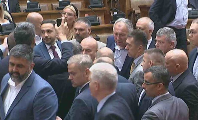 Në Kuvendin e Serbisë sot krisi një tollovi e madhe. Deputetët e opozitës ishin ata që u larguan nga vendet e tyre dhe u sulën drejt vendit ku qëndronin pjesëtarë e kabinetit qeveritar serb dhe ulëses së kryekuvendarit atje, Vladimir Orliq.