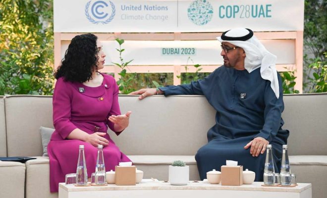 Presidentja e Republikës së Kosovës, Vjosa Osmani, është pritur në takim nga Presidenti i Emirateve të Bashkuara Arabe, Lartmadhëria e Tij, Sheikh Mohamed bin Zayed Al Nahyan në Dubai, ku po zhvillon punimet e COP28, konferenca kryesore globale.