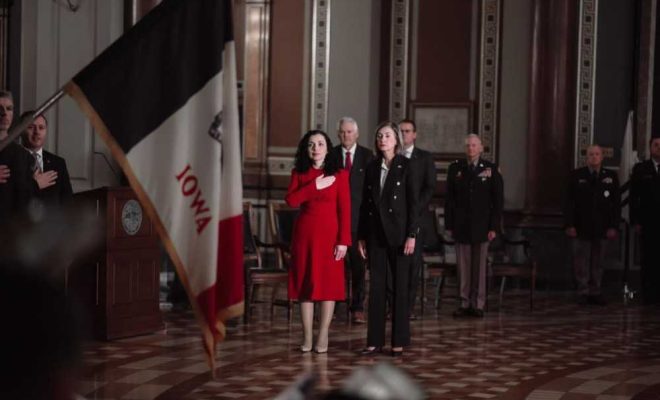 Presidentja e Kosovës, Vjosa Osmani, dhe zotëria i parë, Prindon Sadriu, u pritën me pritje ceremoniale nga Guvernatorja e Iowa-s, Kim Reynolds dhe zotëria i parë, Kevin Reynold. Presidentja e falënderoi Guvernatoren për pritjen dhe për vizitën bërë Kosovës, në muajin qershor të këtij viti.