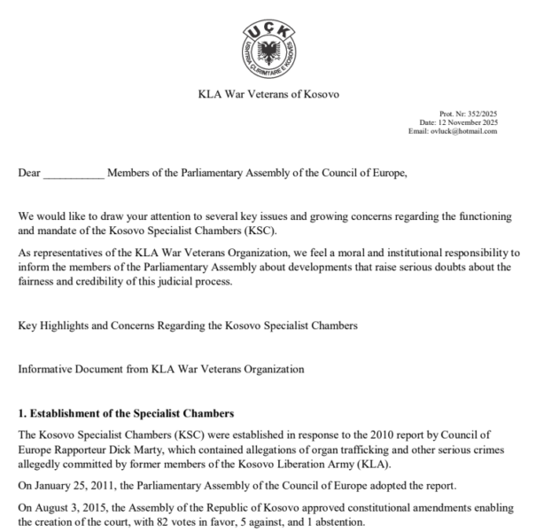 Organizata e Veteranëve të Luftës së UÇK’së ka njoftuar se gjatë protestës së sotme në Strasburg të Francës i kanë dërguar 285 letra secilit anëtar të Asamblesë së Këshillit të Evropës për “shqetësimet lidhur me procesin në Gjykatën Speciale”.