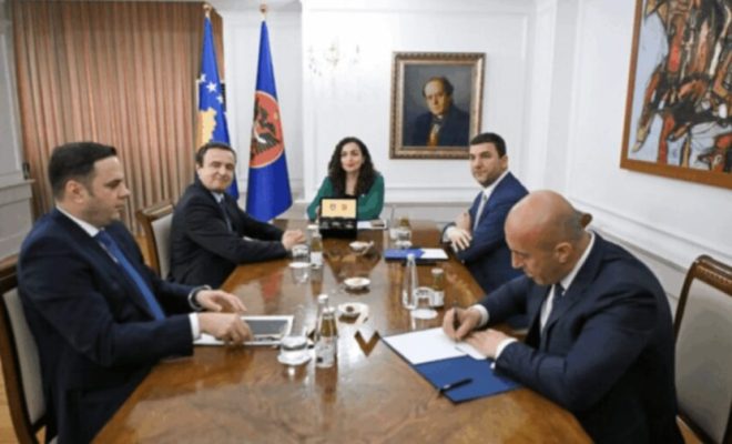 Ka nisur takimi i presidentes Vjosa Osmani me liderët e partive politike, Memli Krasniqin PDK, Lumir Abdixhikun LDK, Ramush Haradinajn AAK dhe Albin Kurtin VV.