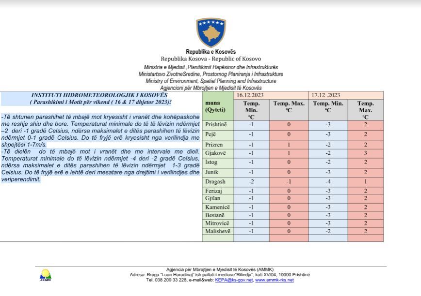 Ndërsa të dielën parashihet të mbajë mot i vranët dhe me intervale me diell. Temperaturat minimale do të lëvizin ndërmjet -4 deri -2 gradë Celsius, ndërsa maksimalet e ditës parashihen të lëvizin ndërmjet 1-3 gradë Celsius.