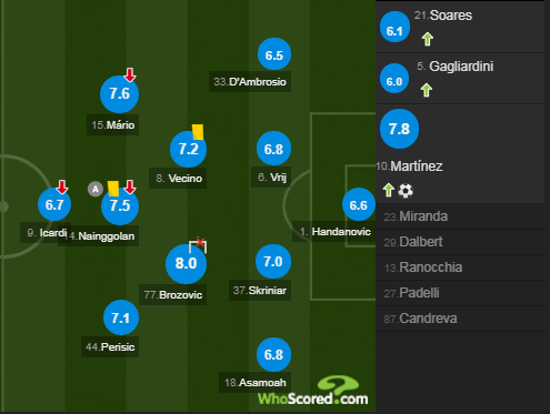 Megjithatë, lojtari më i vlerësuar i ndeshjes ishte mesfushori Marcelo Brozovic, i cili u notua me 8.0.