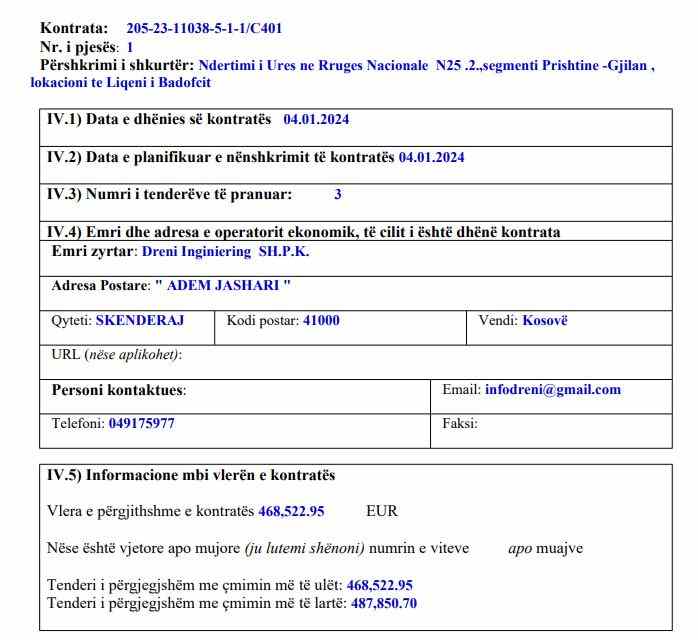 “Dreni Inginiering Sh.P.K.”, një kompani lokale me bazë në Skenderaj, është përzgjedhur fituese e kontratës në vlerë 468 mijë euro.