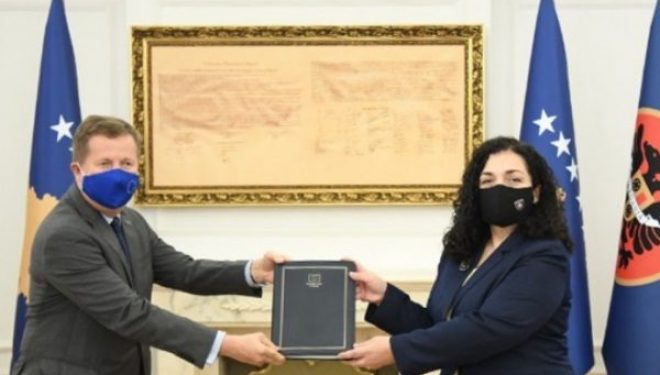 Presidentja e Republikës së Kosovës, Vjosa Osmani sot ka pranuar “Raportin e Komisionit Evropian për Kosovën” nga shefi i Zyrës së Bashkimit Evropian në Kosovë, Tomáš Szunyog.