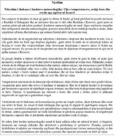 Instituti Hidrometeorologjik i Kosovës ka njoftuar se do të jetë ndryshim të theksuar të kushteve meteroligjike, ulje të temperaturave, reshje bore dhe rrezik nga ngricat.