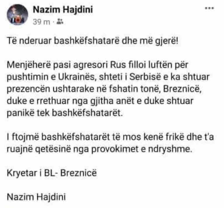 “Menjëherë pasi agresori Rus filloi luftën për pushtimin e Ukrainës, shteti i Serbisë e ka shtuar prezencën ushtarake në fshatin tonë, Breznicë, duke e rrethuar nga gjitha anët e duke shtuar panikë tek bashkëfshatarët”, ka shkruar.