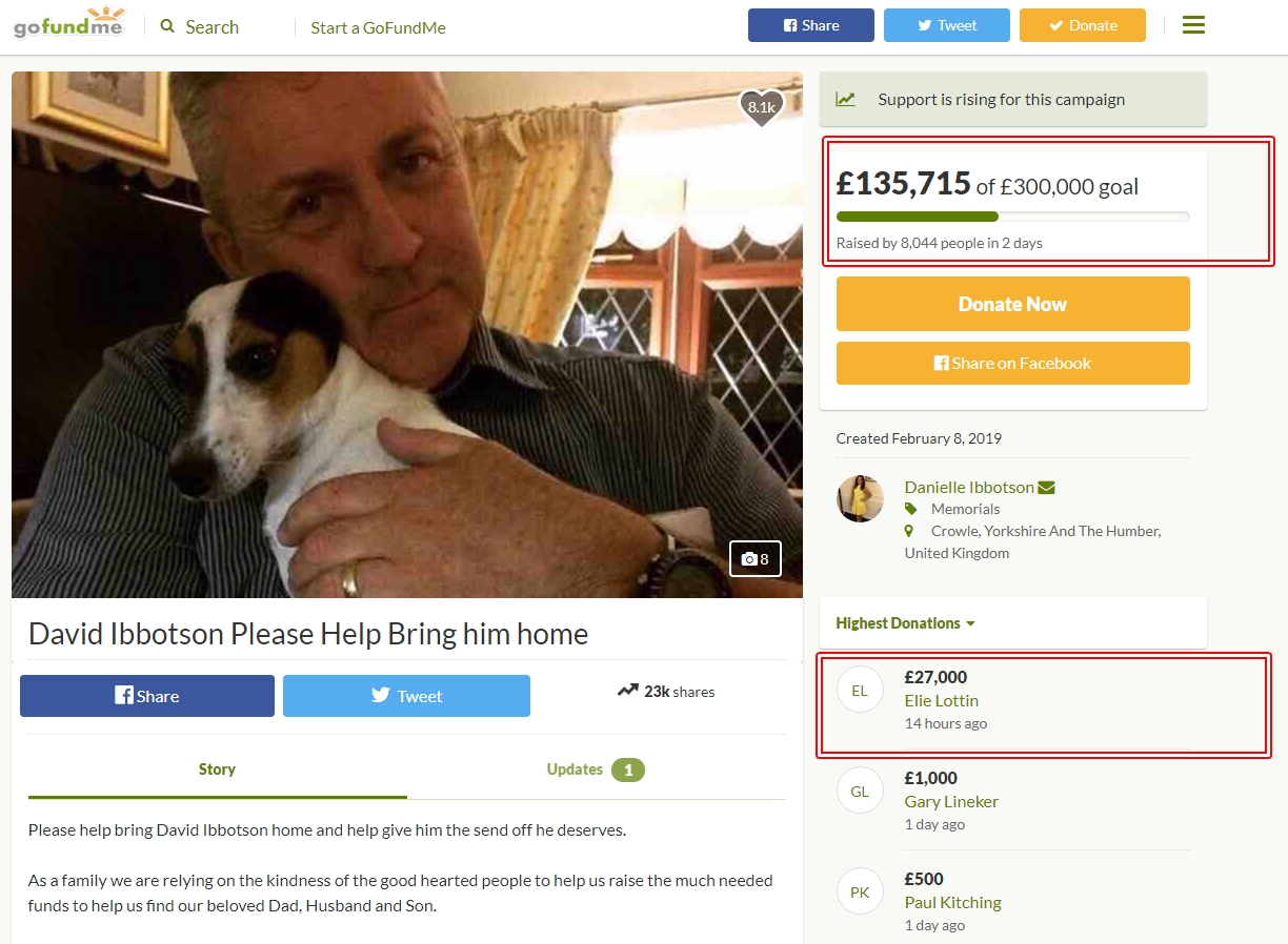 Familja e sulmuesit të Cardiff Cityt ia arriti qëllimit, por jo edhe ajo e Ibbotson, kështu familja e pilotit ka hapur një donacion publik, ku për të filluar kërkimet duhet 300 mijë funte (342.81 euro).