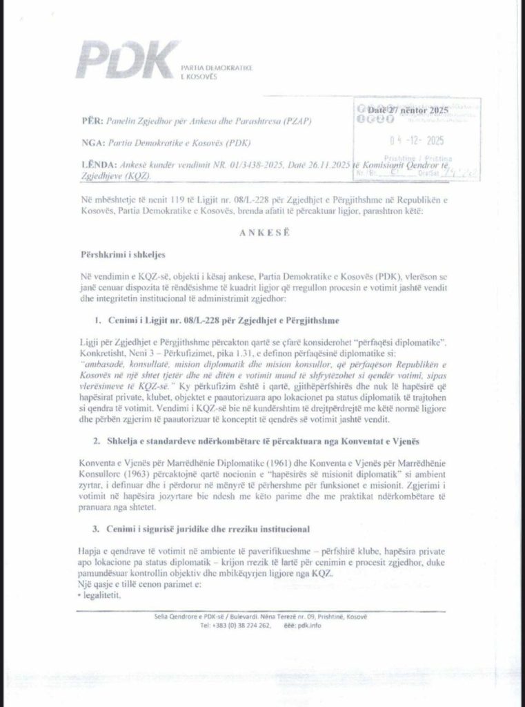 Partia Demokratike e Kosovës (PDK) ka paraqitur ankesa në Panelin Zgjedhor për Ankesa dhe Parashtresa (PZAP) kundër vendimit nr. 01/3438-2025 të Komisionit Qendror të Zgjedhjeve (KQZ), të datës 26.11.2025.