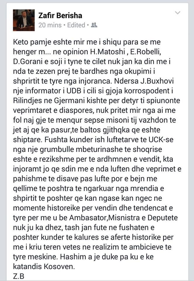 Kryetari i Bashkimit Demokratik, Zafir Berisha, ka mohuar se ka pasur për qëllim t’i ofendojë gazetarët në një postim të tij që ka bërë sot gjatë ditës.