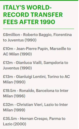 Transferimi i fundit që e theu rekordin në Itali ishte blerja e Hernan Crespo nga Lazio te Parma për 35.5 milionë funte, ndërsa BBC në atë kohë e kishte quajtur çmenduri.