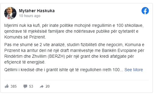 “Është për keqardhje që jo për herë të parë edhe disa asamblistë të VETËVENDOSJES koordinohen me këta të PDKsë, LDKsë, NISMAs dhe AAKsë, për sabotimin e projekteve qeveritare”, kishte shkruar Haskuka në Facebook.