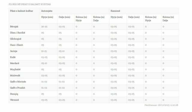 Sipas Qendrës Kombëtare për Menaxhimin Kufitar, pritjet deri në 25 minuta janë regjistruar në pikën kufitare në Bërnjak, ndërsa në pikat e tjera kufitare ato variojnë nga 3 deri në 10 minuta, me përjashtim të Jarinjës që pritjeve i shtohen edhe 5 minuta.