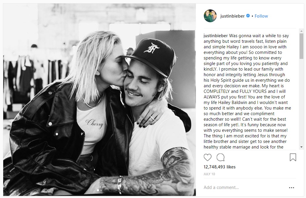 Në vendin e tretë renditet postimi i Justin Bieber për fejesën me bukuroshen Hailey Baldëin. Kjo foto është si e treta më e pëlqyera në histori me 12,7 milionë pëlqime.