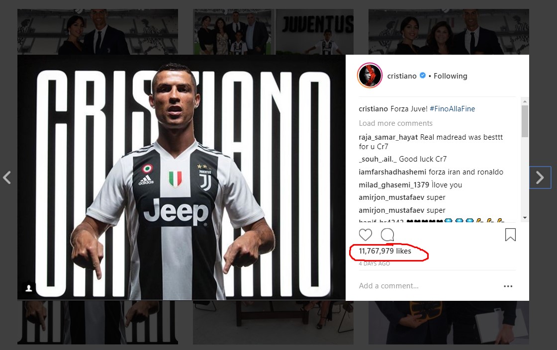 Kurse, CR7, që për nga sportistët është i pari, mban pozitat katër dhe pesë për nga fotot e pëlqyera në histori.Portugezi e ndërroi Real Madridin me Juventusin javën e kaluar dhe postoi në llogarinë personale “Forza Juve”, me fanellë të Juventusit.Katër ditë pas postimit, Ronaldo kaloi 11.7 milionë pëlqime, duke vendosur rekord për foton më të pëlqyer të të gjitha kohëve të postuar nga një sporti