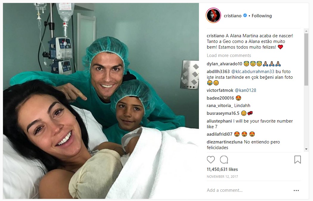 Ndërsa në pozitën e pestë është po ashtu CR7 me foton me Georgina Rodriguez e Cristiano Junior, pak çaste pas lindjes së fëmijës së katërt, Alana Martina me 11,4 milionë pëlqime, shkruan Insporti.