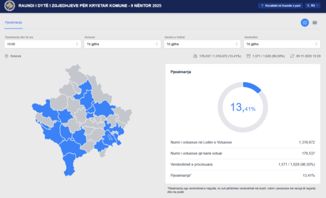 Sipas të dhënave më të fundit nga Komisioni Qendror i Zgjedhjeve (KQZ), deri në orën 13:00 kanë votuar 176,537 qytetarë, që përbën 13.33% të numrit të përgjithshëm të votuesve në listën zgjedhore.