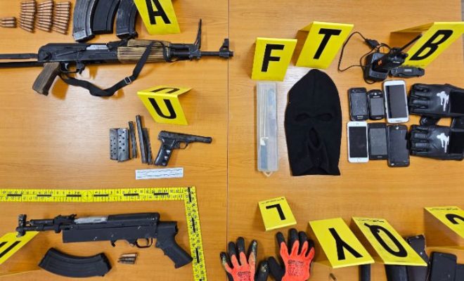 Sipas njoftimit, gjatë kontrollit të dy shtëpive janë gjetur dhe konfiskuar: 3 armë të zjarrit , 2 pushkë automatike dhe një pistoletë, sasi e municionit , karikatorë, një radiolidhje, sasi e narkotikëve, një shufër metalike, dorëza , maskë ,telefona, me të cilat dyshohet se është kryer grabitja.