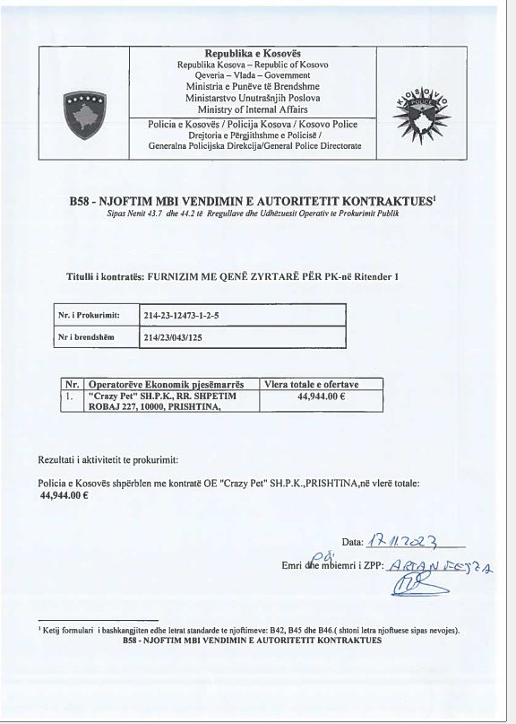 Tenderi për blerjen e qenëve është hapur përmes procedurës së negociuar pa publikim të njoftimit për kontratë me operator ekonomik “Crazy Pet” Sh.P.K në Prishtinë.