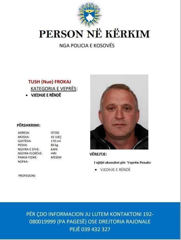 Policia e Kosovës – Drejtoria Rajonale e Policisë në Pejë, bazuar në ligj për publikimin e fotos me shënime tjera të personit të kërkuar më Urdhëresë të Gjykatës Themelore nё Pejё dega në Klinë, me qëllim lokalizimin dhe rrjedhimisht arrestimin e tij, lëshon: Kërkesë për bashkëpunim me qytetarët.