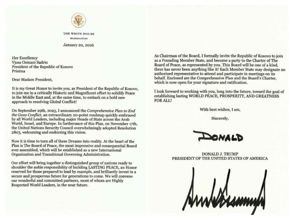 Presidentja e Republikës së Kosovës, Vjosa Osmani, ka njoftuar se është ftuar personalisht nga Presidenti amerikan Donald Trump për të përfaqësuar Kosovën në Bordin e Paqes, si anëtare themeluese.