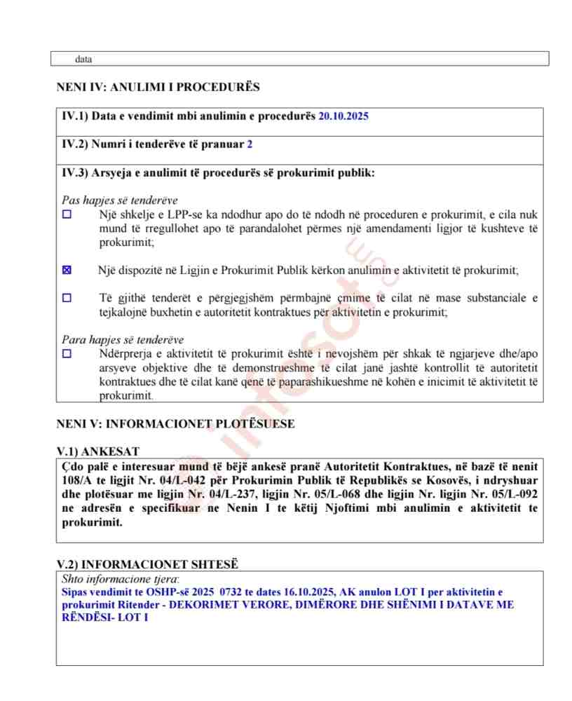 Tenderi për “Dekorimet verore, dimërore dhe shënimin e datave me rëndësi”, ishte shpallur nga Kuvendi i Komunës së Prishtinës në fillim të shtatorit, ndërsa në garë kishin aplikuar dy operatorë ekonomikë. Sipas njoftimit zyrtar të publikuar më 20 tetor 2025, autoriteti kontraktues, Komuna e Prishtinës, ka anuluar aktivitetin e prokurimit pas vendimit të OSHP-së të datës 16 tetor 2025. Në dokument thuhet se anulimi është bërë për shkak të një dispozite ligjore të përcaktuar në Ligjin për Prokurimin Publik, e cila obligon ndërprerjen e procedurës në rrethana të caktuara.