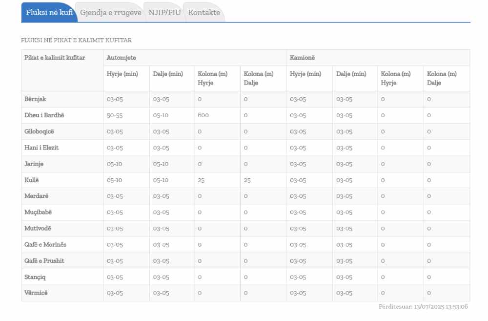 Sipas përditësimit të fundit të Qendrës Kombëtare për Menaxhim Kufitar vetëm te ”Dheu i Bardhë” pritjet janë për rreth 1 orë, ndërsa në pikat tjera kufitare nuk ka kolona të gjata.