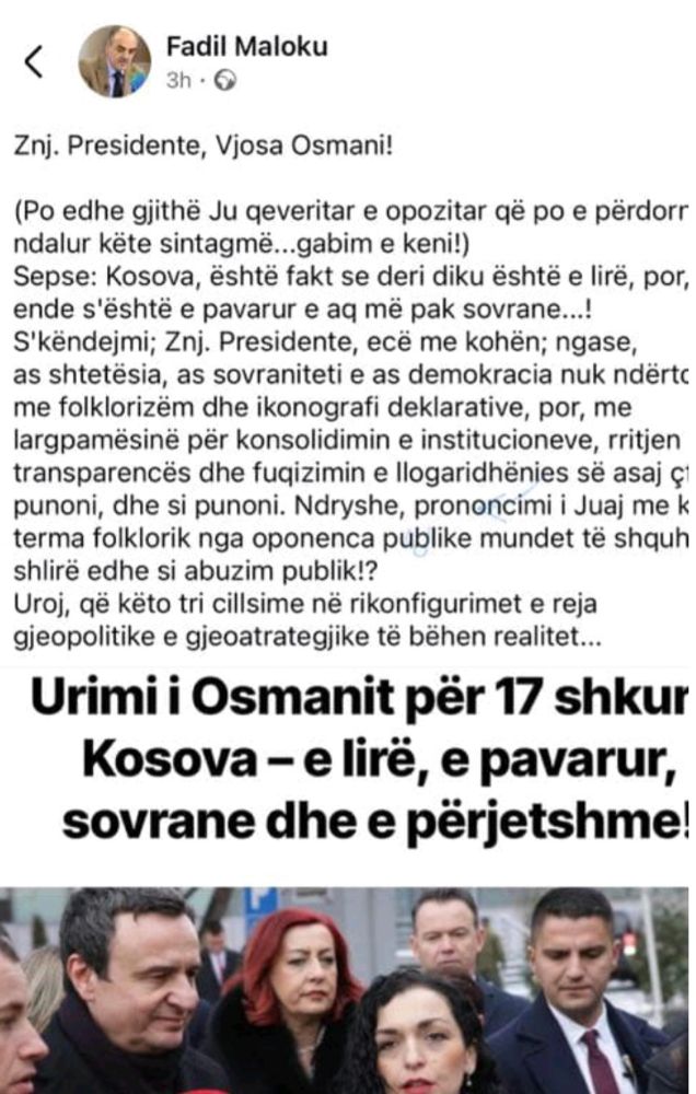 Uroj, që këto tri cillsime në rikonfigurimet e reja gjeopolitike e gjeoatrategjike të bëhen realitet…”, ka shkruar në reagimin e tij sociologu Fadil Maloku.