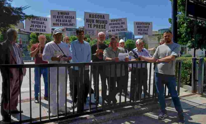 Disa qytetarë janë mbledhur sot në hyrje të Kuvendit të Kosovës për të protestuar kundër bllokimit të vazhdueshëm të konstituimit të institucioneve pas zgjedhjeve të fundit, raporton Ekonomia Online.