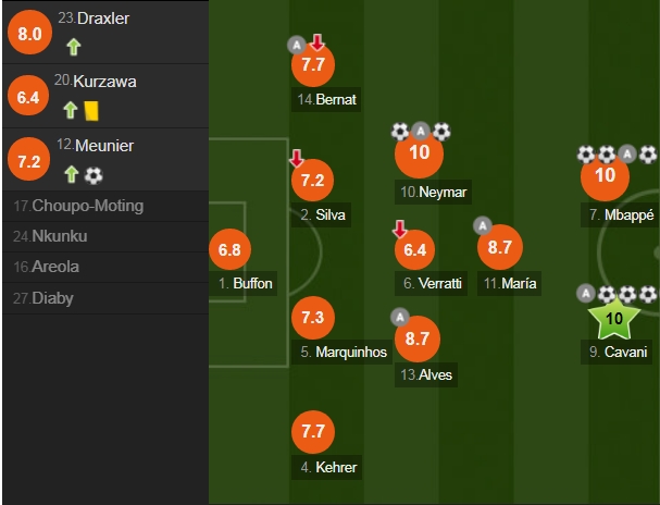 Golat në këtë takim për vendasit i shënuan Neymar (11′, 68), Kylian Mbappe (37′, 45′, 80′) dhe Edinson Cavani (59′, 66′, 75′) dhe Thomas Meunier (83′).