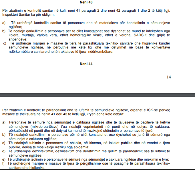 Po ashtu, të përcaktuara në këtë Ligj janë edhe kompetencat për ndalimin e qarkullimit në rajonet e infektuara, ndalimi i udhëtimit në vendin ku është përhapur epidemia e ndonjërës nga këto sëmundjet e përcaktuara në Ligj, e ku përfshihen edhe sëmundjet që shkakton SARS.