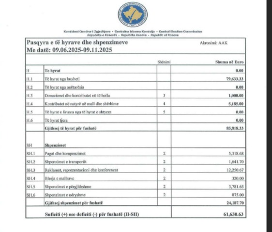 Ndërsa AAK e Ramush Haradinajt ka shpenzuar më së paku për fushatë, duke raportuar vetëm 24 mijë e 187 euro dhe të hyra rreth 86 mijë euro.