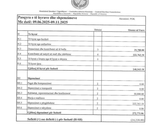 Partia Demokratike e Kosovës në raportin e dorëzuar në KQZ ka raportuar shpenzime rreth 273 mijë euro, derisa të hyra rreth 249 mijë euro.
