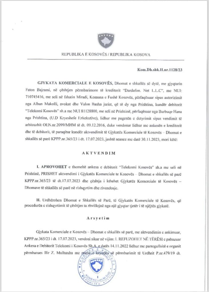 “Aprovohet e themeltë ankesa e debitorit “Telekomi i Kosovës” sh.a. me seli në Prishtinë. Prishet aktvendimi i Gjykatës Komerciale të Kosovës – Dhomat e shkallës së parë KPPP.nr.365/23 të dt.17.07.2023 dhe çështja i kthehet Gjykatës Komerciale të Kosovës – Dhomave të shkallës së parë në rishqyrtim dhe vendosje”, thuhet në aktvendimin e datës 30 nëntor 2023.