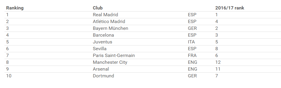 Pa asnjë çudi gjiganti spanjoll, Real Madridi, është në krye të kësaj liste për vitin e pestë radhazi.