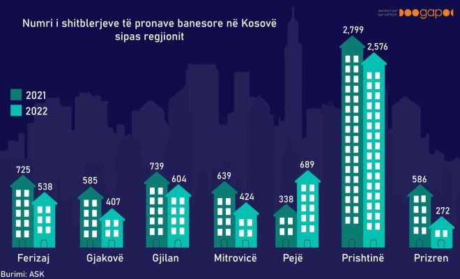 Në grafikonin e GAP, ilustrohet rënia e e shitblerjeve te pronave banesore ne vitin 2022, krahasuar me vitin 2021. Rukiqi thotë se i njëjti trend ka vazhduar edhe këtë vit.