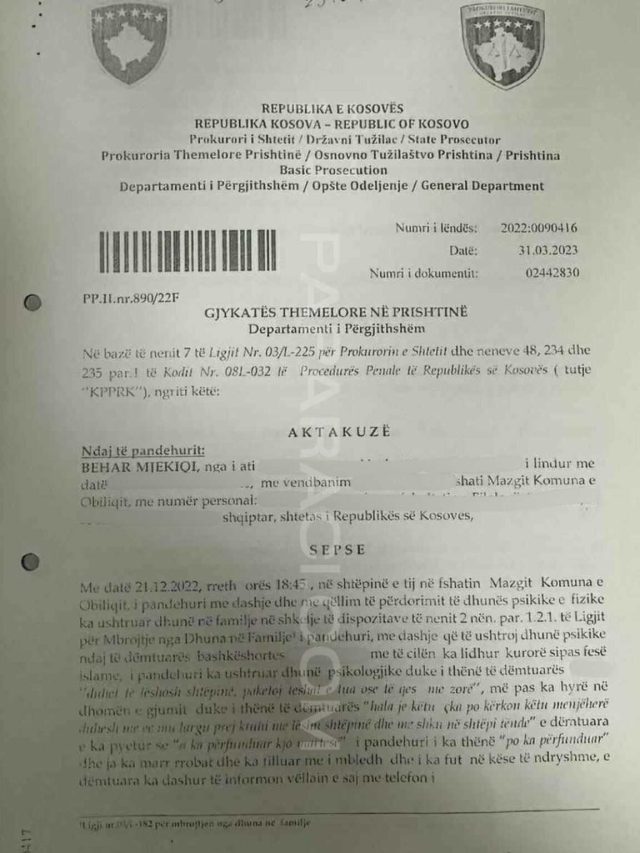 Prokuroria Themelore në Prishtinë ka ngritur aktakuzë ndaj imamit Behar Mjekiqi, për veprën penale “Dhunë në familje”. Aktakuza përshkruan me hollësi një ngjarje të rëndë familjare që ka ndodhur më 21 dhjetor 2022, duke përfshirë dhunë fizike, psikologjike, kërcënime dhe privim nga liria e lëvizjes.