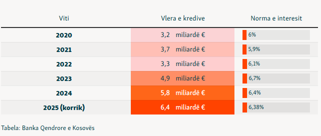Sipas të dhënave të BQK-së, dërguar REL-it, norma mesatare e interesit në kredi në korrik të vitit 2025 ishte 6.38%, nga 6.17% një vit më parë.