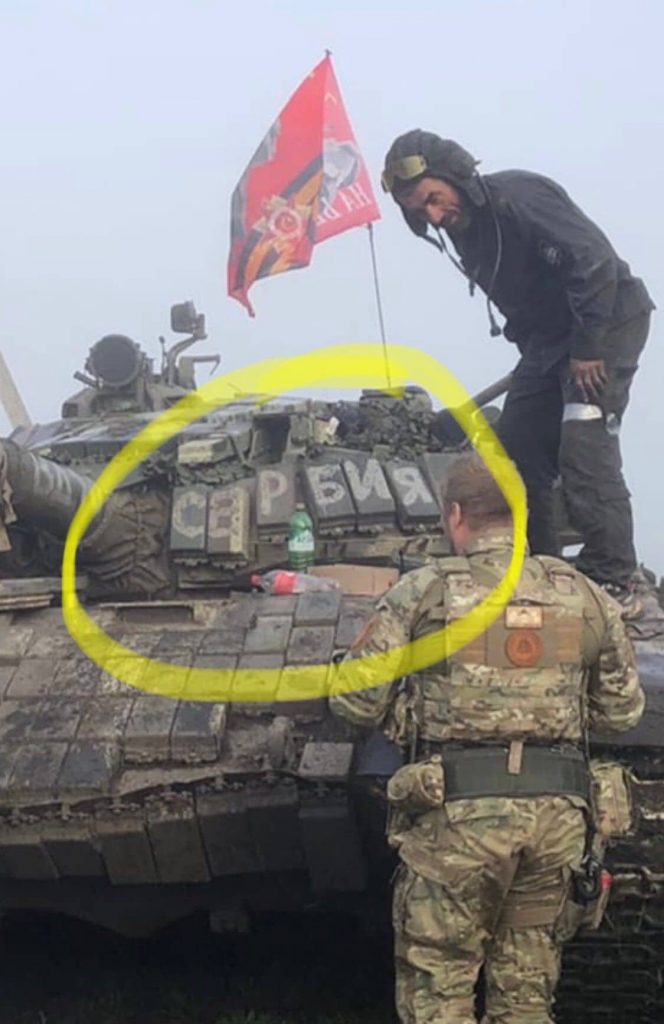 Dhe jo vetëm kaq… dje janë publikuar fotografi të forcave ruse në Shevchenko, rajonin e Kharkivit, ku është raportuar për krime të shumta ndaj civilëve ukrainas. Në këtë fotografi, forcat ruse pozojnë para një tanku në të cilin është shkruar në rusisht “Serbia”