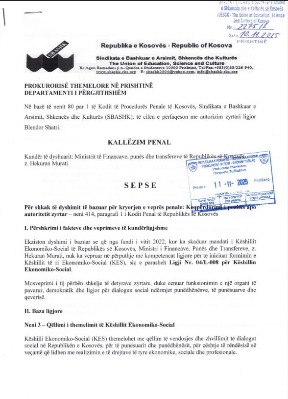 Kjo sindikatë thekson se kallëzimi është bërë “për shkak të dyshimit të bazuar të keqpërdorimit të detyrës zyrtare, duke mos vepruar sipas Ligjit për Këshillin Ekonomik Social, duke mos shpallur që nga fundi i vitit 2022 ftesën për formimin e këtij Këshilli për çka është i obliguar ligjërisht”.