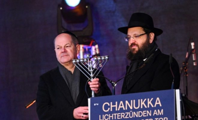 Scholz e ka ndezur qiriun e parë në një shandan të gjatë me nëntë shtylla, të njohur si hannukiah, në Portën e Brandenburgut.