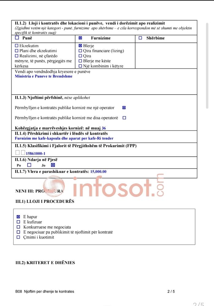 Fillimisht, më 19 qershor 2025, MPB shpërbleu një kontratë trevjeçare në vlerë 14,779 euro për furnizim me kapsula kafeje dhe aparat për kafe, të cilat do të shërbejnë gjatë tri viteve të ardhshme në zyrat e ministrisë. Kontrata iu dha kompanisë Proaktiv One L.L.C. nga Prizreni, dhe parasheh që për 36 muaj, ministria të furnizohet rregullisht me këtë produkt.