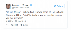 “Të them të drejtë nuk kisha dëgjuar kurrë për ‘National Review’ derisa ‘u përpoqën’ të deklarojnë luftë kundër jush. Pa merak, ju tashmë e keni votën time”, ka shkruar ajo në Twitter, mesazhin që është ripërsëritur fjalë për fjalë nga Trump.