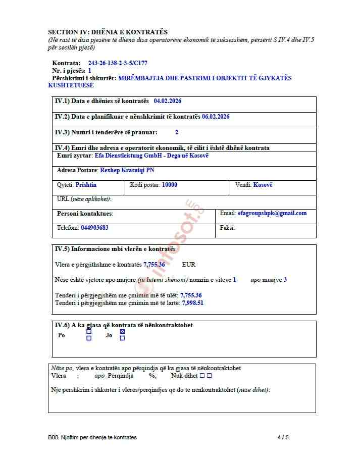 Vlera e parashikuar e kontratës ka qenë 8,800 euro, ndërsa vlera përfundimtare e kontratës së dhënë është 7,755.36 euro për një periudhë tre mujore. Kontrata pritet të nënshkruhet më 6 shkurt 2026, ndërsa është dhënë kompanisë “Efa Dienstleistung GmbH – Dega në Kosovë”, me seli në Prishtinë.